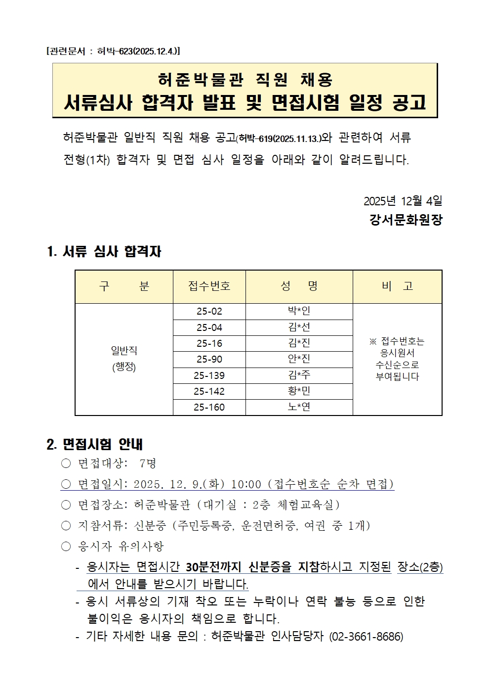 허준박물관 직원 채용 서류심사 합격자 발표 및 면접시험 일정 공고