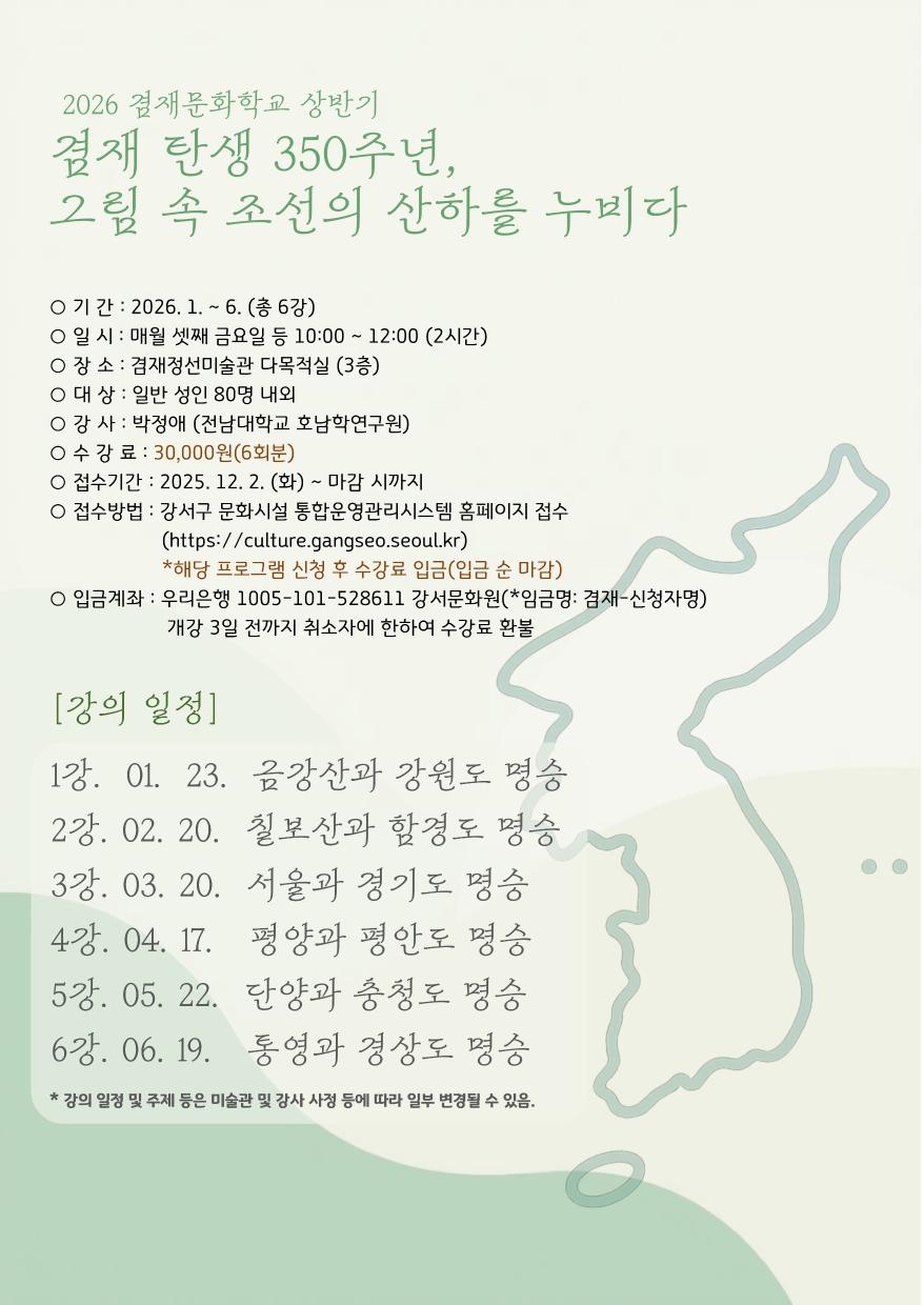 2026 겸재문화학교 상반기 <겸재 정선 탄생 350주년, 조선의 산하를 누비다>