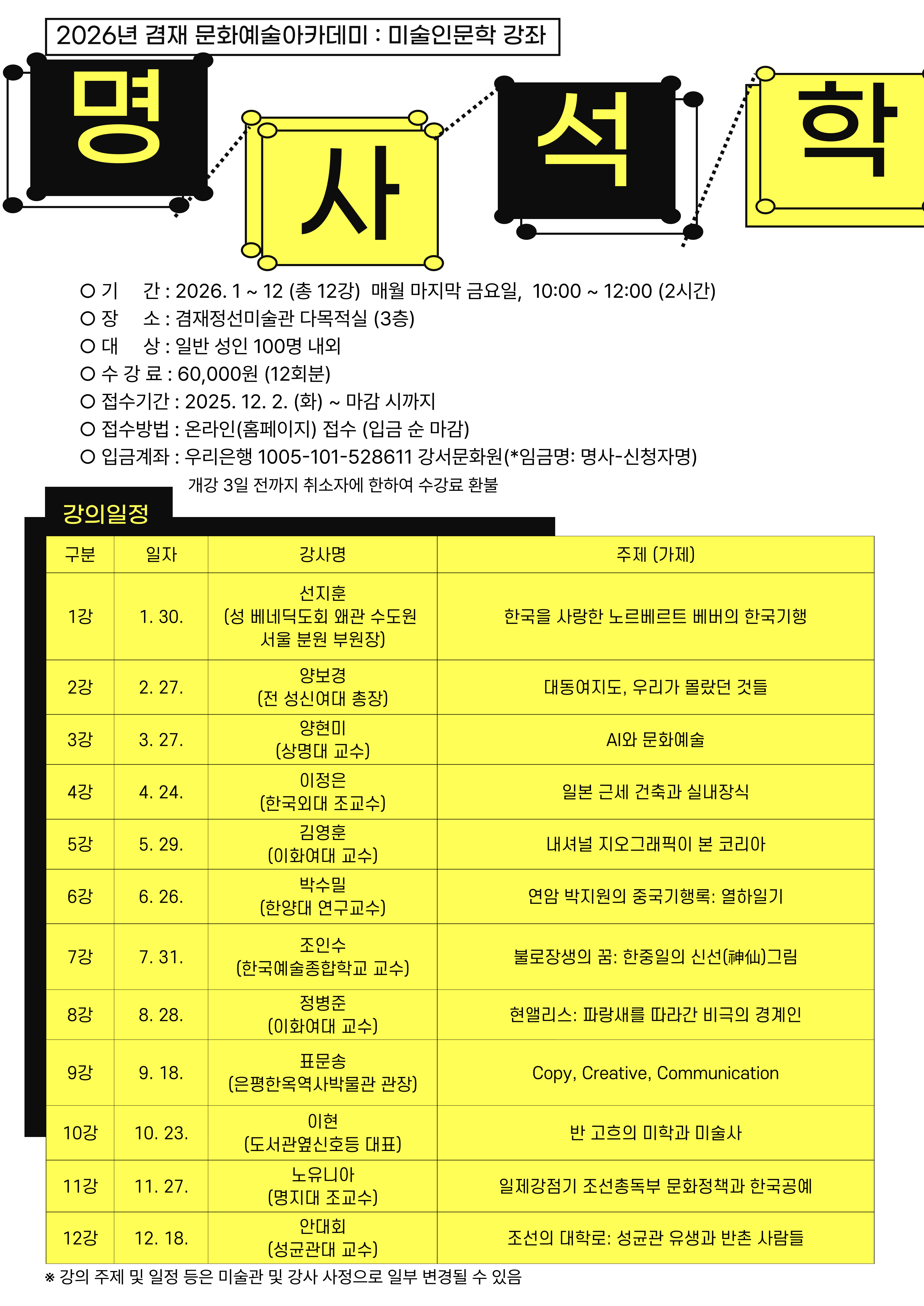 프로그램명/ 프로그램일시 2026 명사석학 미술인문학 강좌 2026.01.30 10-12 |