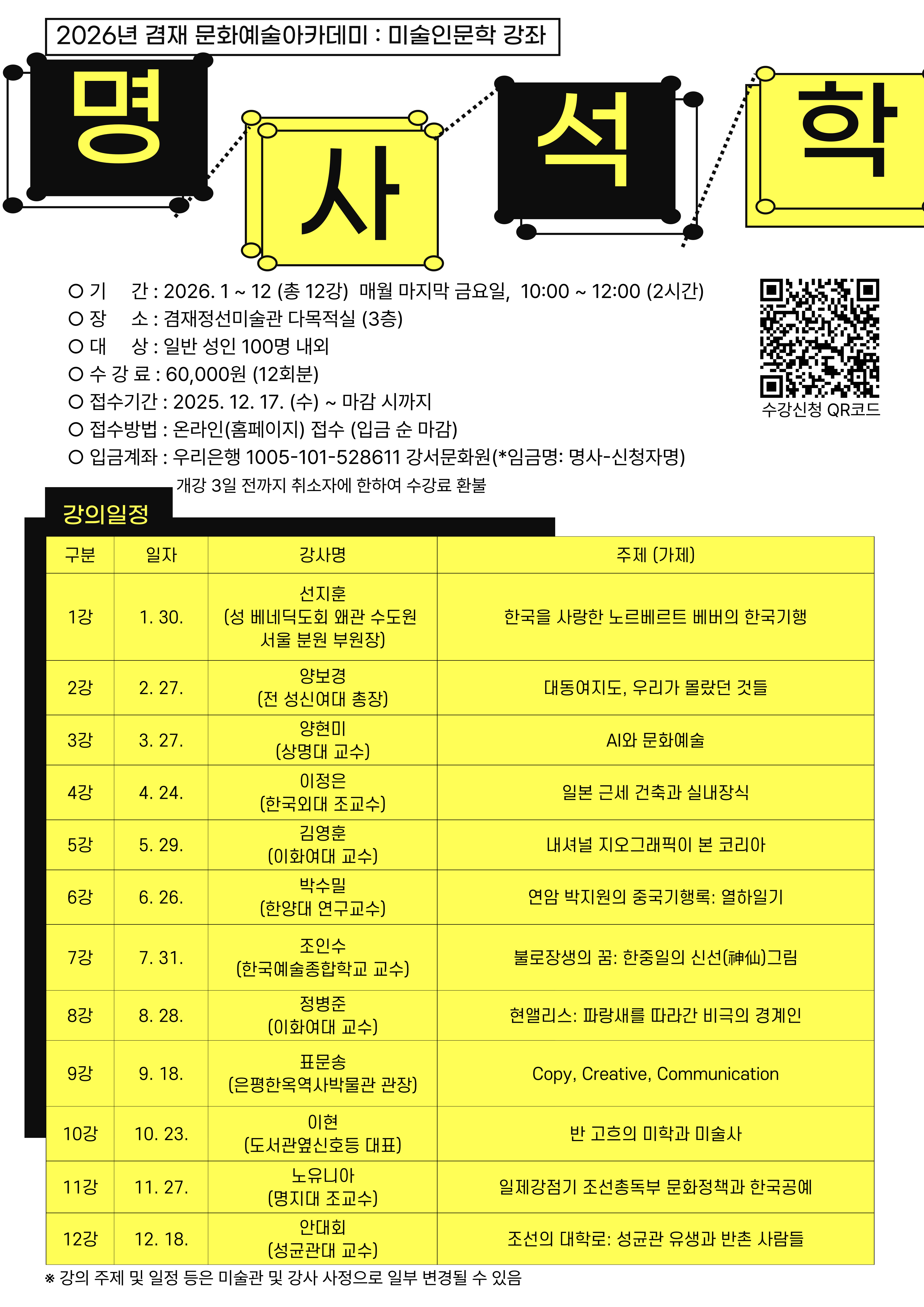 프로그램명/ 프로그램일시 2026 명사석학 미술인문학 강좌 2026.01.30 10-12 |